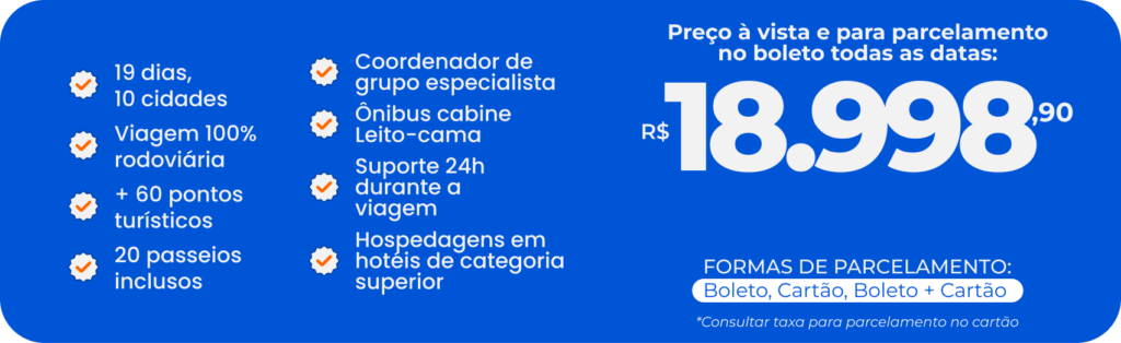Nossas viagens são realizadas em ônibus cabine leito-cama, com foco em conforto real para longas distâncias, e contam com hotéis de categoria superior, cuidadosamente selecionados. Tudo é pensado para que o viajante tenha segurança, organização e tranquilidade em cada etapa.
